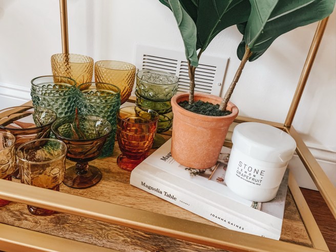 BAR CART target threshold wood & gold finish bar cart | PICTURE target project 62 be you framed wall canvas | VASE wayfair raycliff pitcher| WINE GLASSES amazon square glass set of 2| OIL DIFFUSER target project 62 passion fruit & amber | WOOD BEAD GARLAND amazon wood bead garland| PLANT target fiddle leaf fig plant| CANDLE project 62 glass jar candle| BOOK magnolia table volume 2 – joanna gaines