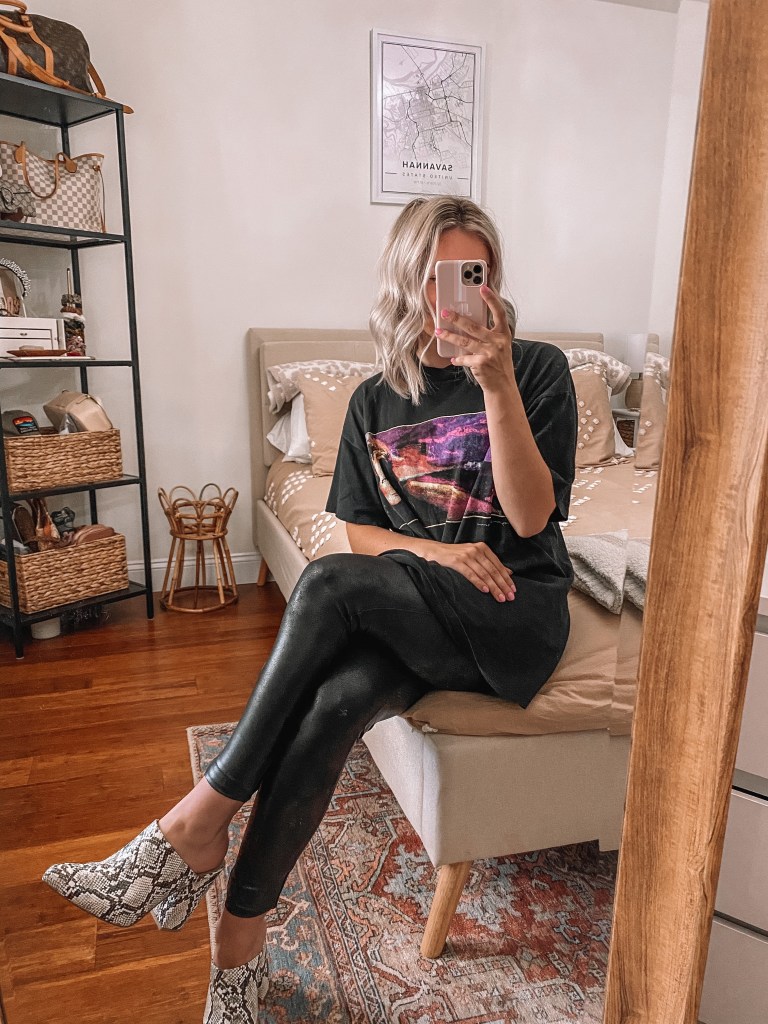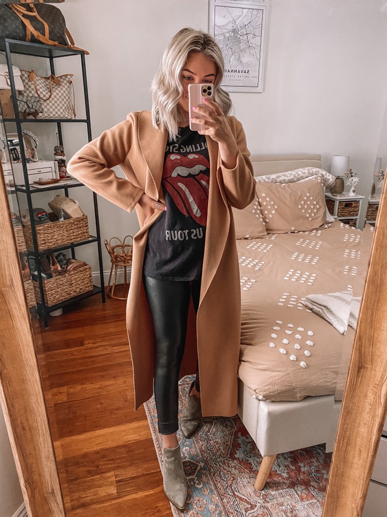 For this outfit I added this long cardigan/coat from shein. It makes it a little more dressed up but also kind of still casual. I paired with these booties from Nordstrom and my rolling stone tee from Target. One thing about these leggings that I love is they really can make an outfit come together.