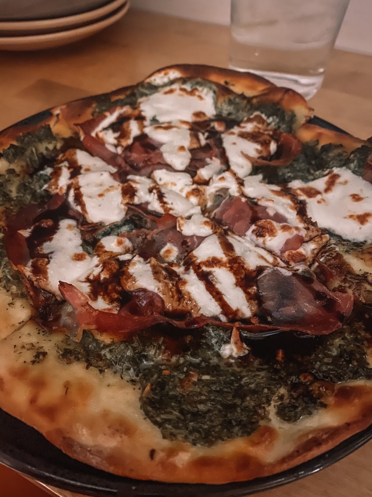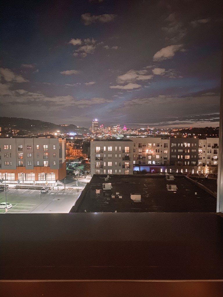 Once it was time to get seated, we went to the roof top where we had a view of the entire city. Honestly, it was so nice especially at night! As for the menu, it was very short. I am not sure if that is normal or just because of Covid but I would say that there is something for everyone on it. I ended up getting the Prosciutto Flatbread which had pesto and balsamic on it…..SO GOOD. One thing that I really loved about the menu was that it was broken down into two categories….small plates and large plates. Also, it tells you all of the allergens in each dish as well as if that dish is vegan. I linked their current menu here. I didn’t really drive around to find parking, I just parked at the hotel which was valet. It ended up being $10 for the whole time being there so that would be something to preplan so you have cash if you choose to do so but all in all it was a great experience and I can’t wait to go back!