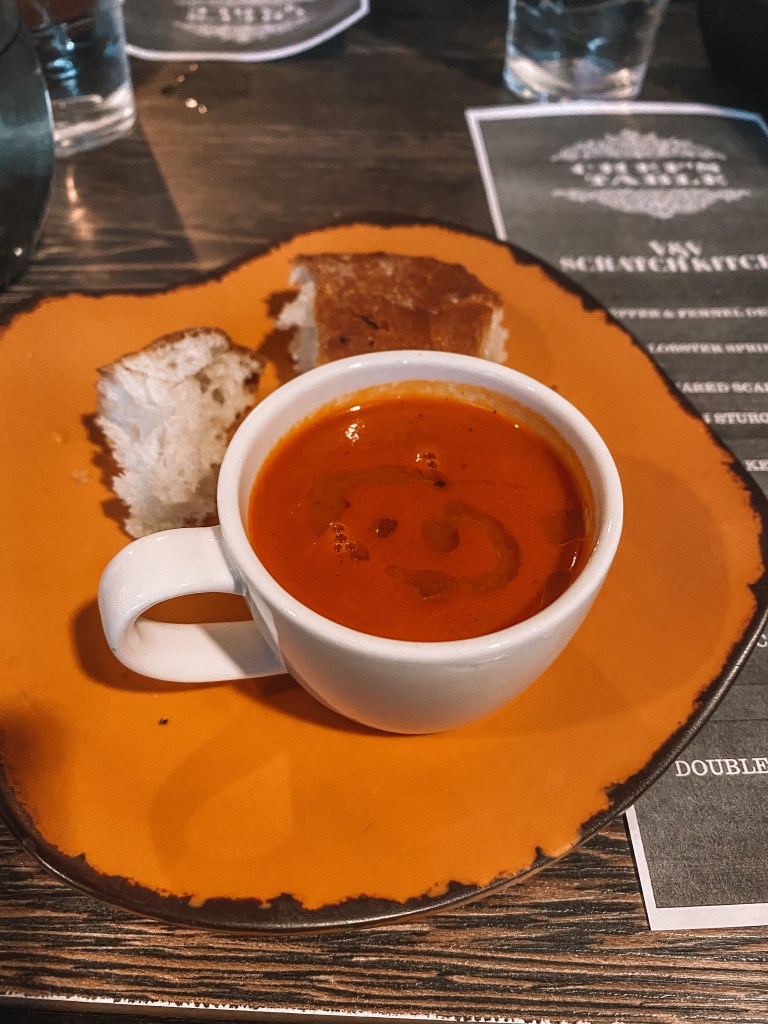 It is BYOB so when we first got there, we had our wine bottles opened and a basket of fresh bed on the table. The first course was Red Pepper & Fennel Demitasse which was like a red pepper soup. It sounded not very appealing, but it was SO good.