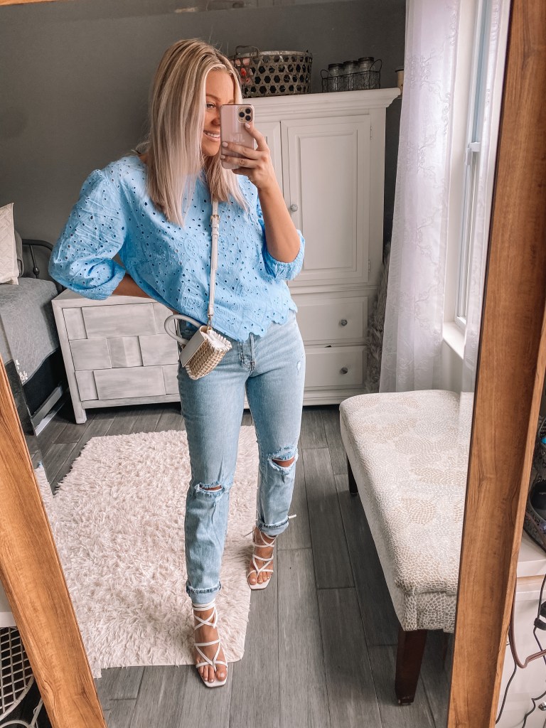 BLOUSE h&m eyelet embroidery blouse | JEANS h&m mom high ankle jeans | SHOES nordstrom louise et cie lehana wraparound (sold out but linked similar) | PURSE forever 21 crossbody