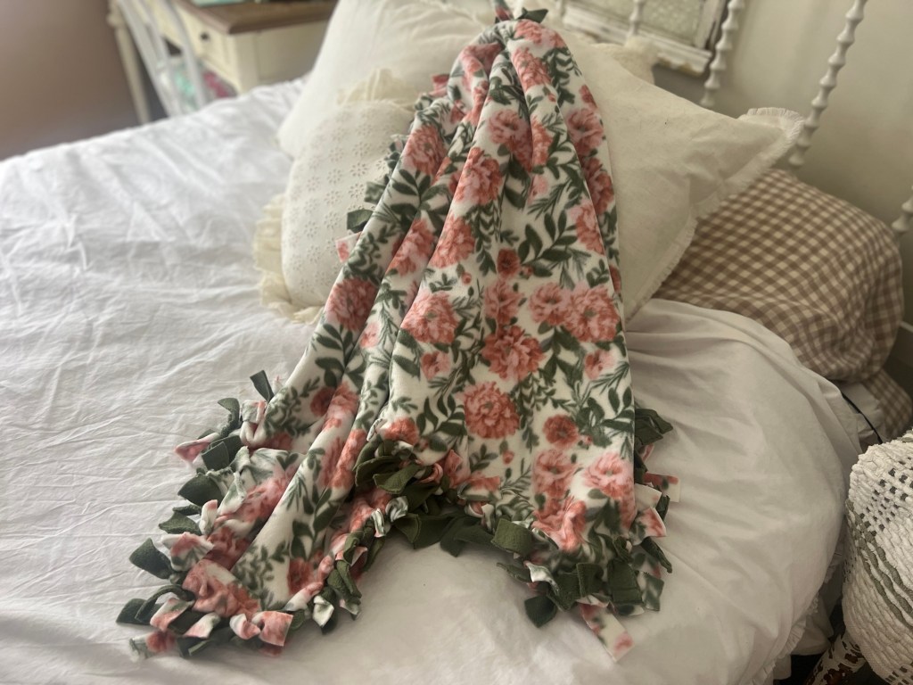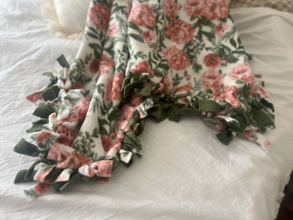 To start out, I went to JoAnn Fabrics to pick out the fleece I wanted. I went with a pretty floral and a green. I bought a yard of each color. Once I got home, I laid one on top of the other and cut a 4×4 inch square on each corner. After doing so, I cut a quarter inch strip around the entire blanket. After that, you simply just tie the top piece with the bottom piece, twice until you’re done. This is super simple and great to do with your little one!