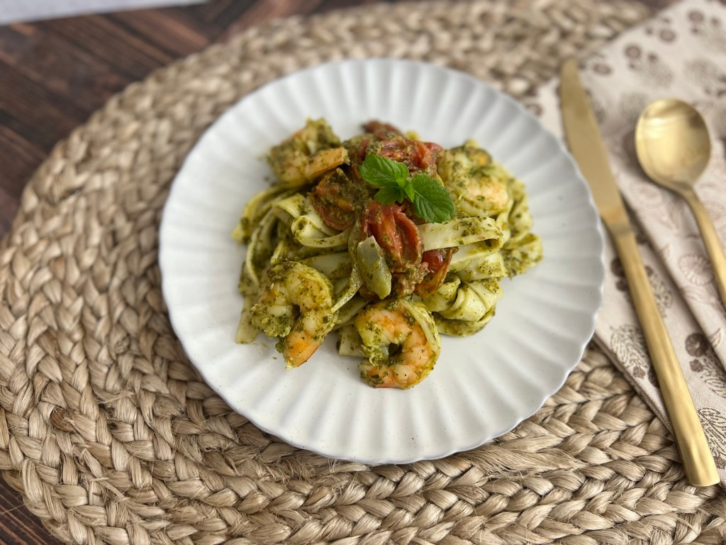 - Heat up shrimp until warm, add tomatoes, onions, and 4 tablespoons of pesto.